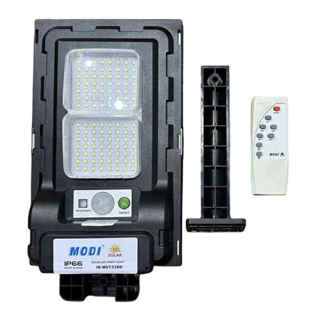 محتویات بسته: چراغ خورشیدی، ریموت کنترل، پایه و کیت نصب